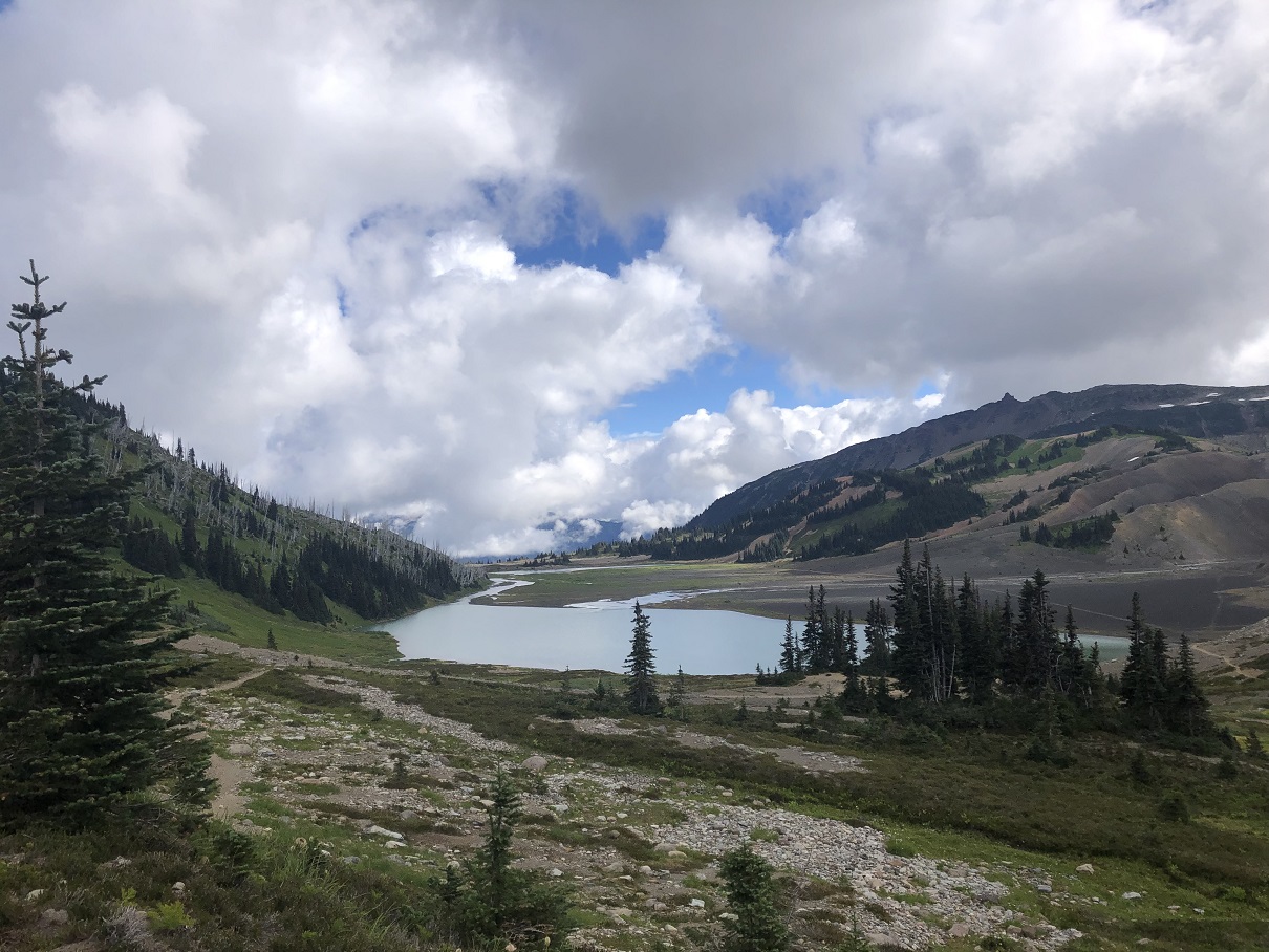 Soon we were on the ridge above the treeline. Looking back, we had a partial but beautiful view of Black Tusk.