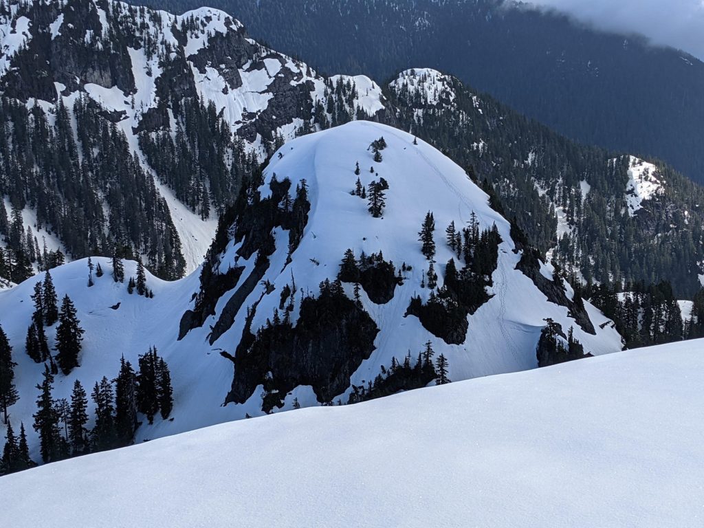 In responding to the NSR rescue post, Russell Coffin posted a picture of Runner Peak that showed our tracks from the previous day. It was taken from Mount Seymour.