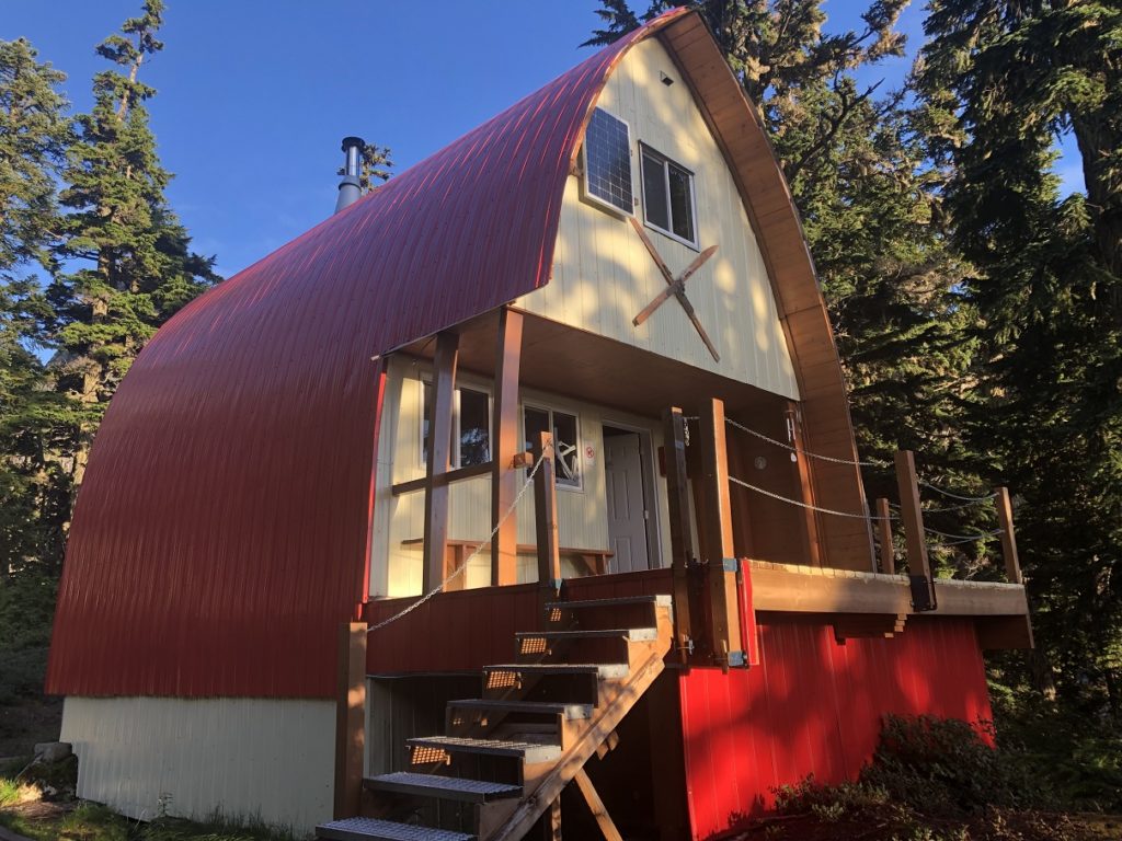 The loft above has two sleeping areas separated by a curtain – one for BCMC custodians and the other for guests. There are some foam pads that are strapped together and can be used as sleeping pads. The outhouse is at the back.