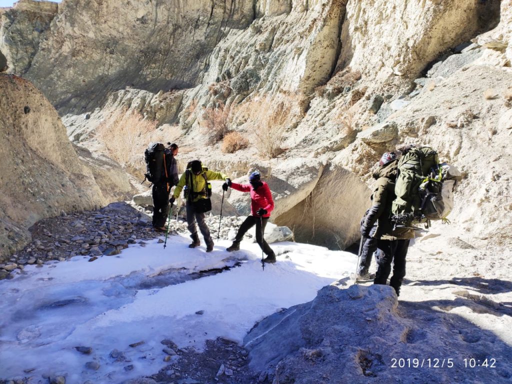 It was all downhill from Ganda la to Shingo, but it still took us roughly four hours to get to our homestay. Icy stream crossings were tricky to cross without any kind of traction gear.